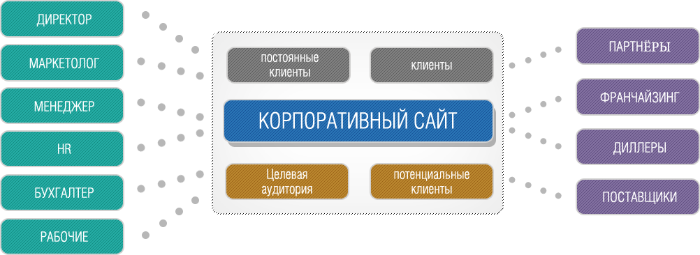 Корпоративный сайт – это web-сайт, цель которого в организации коммуникации и взаимодействия компании с клиентами, партнерами, СМИ, государственными органами, а также между различными отделами компании, филиалами и отдельными сотрудниками.